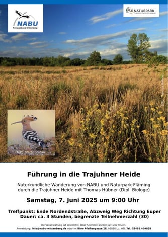 Kreis Wittenberg, 04.05.2025 Ca. drei-stündige Wanderung am 07. Juni 2025, 9 – 12 Uhr, durch die naturschutzfachlich besonders bedeutsamen Flächen des ehemaligen Truppenübungsplatzes an der Nordendstraße in Wittenberg.