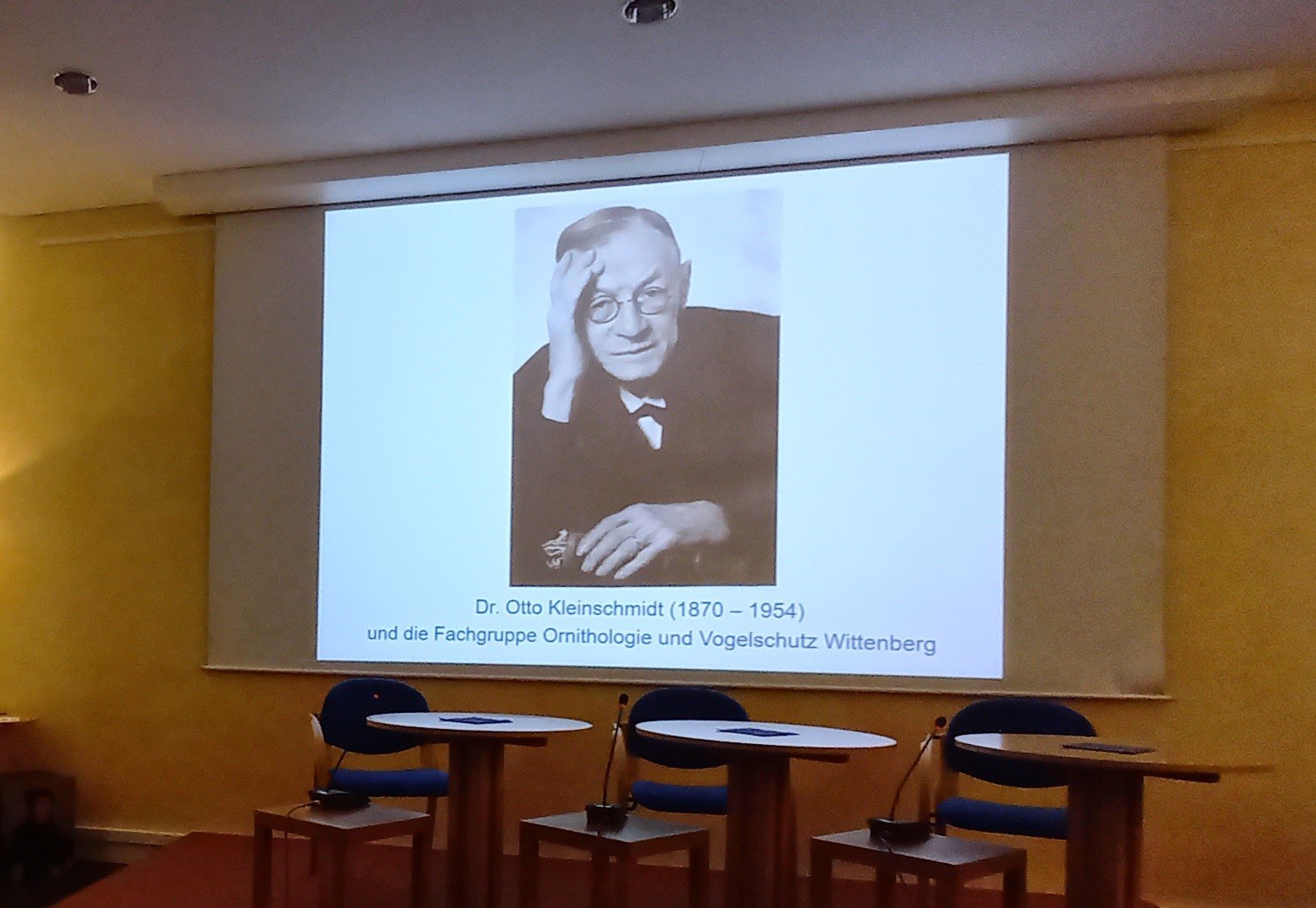 Als Zeitzeuge berichtete anschließend Dr. U. Zubke, wie er als junger Schüler begeistert diesem Lehrer, Ornithologen und begnadeten Maler über die Schulter schauen durfte, so den Zugang zur Forschung fand und sich der Weitergabe dieses Erbe verpflichtet sieht. Mit etlichen Textauszügen und Bildern wie dem berühmten Pfeilstorch, über Kleinschmidts Forschung sowie die Forschungsstätten im Schloß unterstrich Zubke die Bedeutung der Naturforschung in Wittenberg. Viele Buchveröffentlichungen wie „Singvögel der Heimat“ und „Raubvögel der Heimat“ seien damals neben „Brehms Tierleben“ maßgebend gewesen. Kleinschmidt kümmerte sich unter anderem auch um den Nachlass von Brehms Sammlung.
