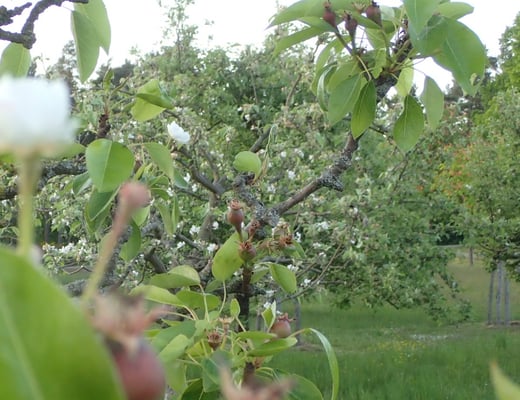 Im Bestand gab es kaum frostbedingte Ausfälle trotz starkem Spätfrost im April − dank der Lage am Oberhang und der abschirmenden Wirkung des nördlich angrenzenden Waldes. Ein großer Teil der Blüten war nicht erfroren und sogar die jungen Bäume trugen Früchte entsprechend ihres Alters. Bäume aus dem Altbestand hatten fast üppigen Fruchtbehang.